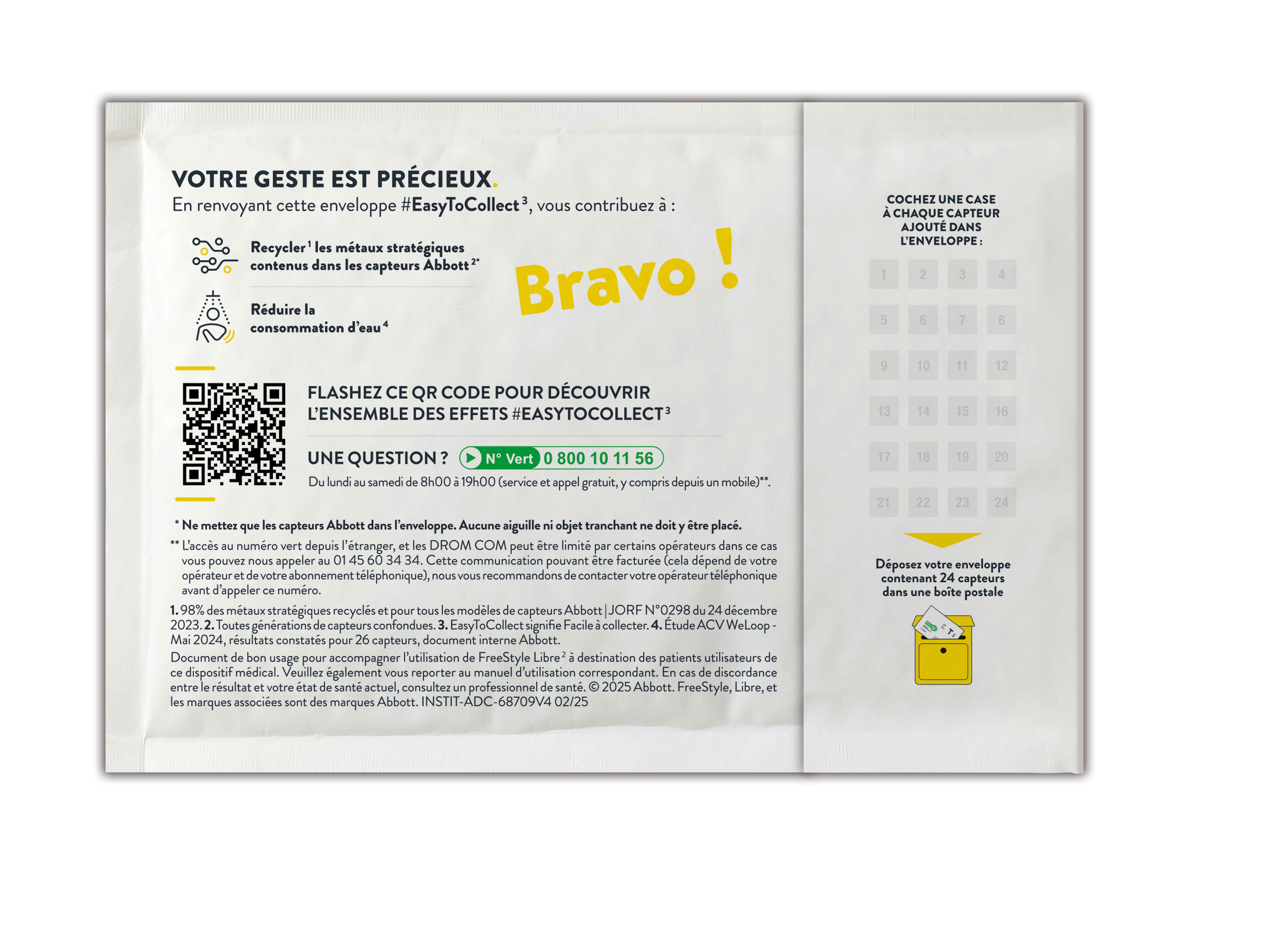 Il faut introduire dans l’enveloppe seulement et uniquement des capteurs FreeStyle Libre sans emballage ni applicateur et au maximum 24 capteurs par enveloppe (soit l'utilisation d'un an de capteurs). Vous pouvez mélanger dans l’enveloppe les capteurs de toutes générations confondues. Ne pas introduire d’aiguille, ni tout autre objet. L’enveloppe de collecte vous sera adressée distinctement de toute commande d’accessoires.